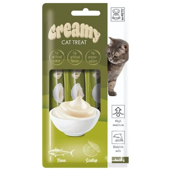 A creamy, tuna and scalloped cat treat with a creamy, moist texture and safe ingredients. No artificial colors, flavors, or preservatives.