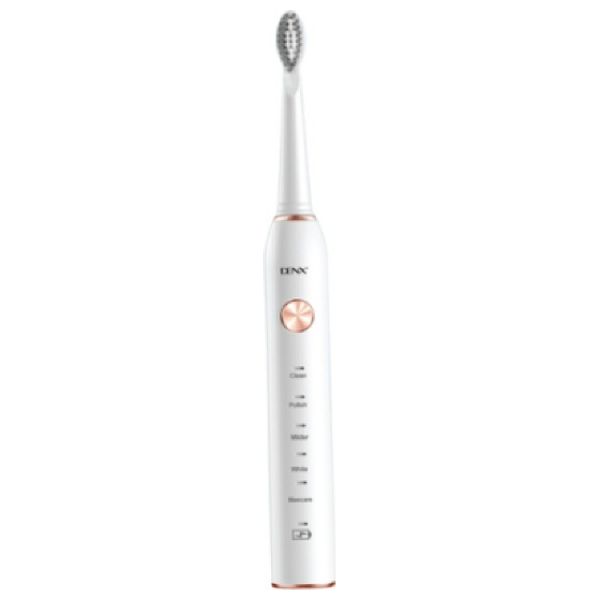 Denx DENX2579 electric toothbrush in Ceramic White. This rechargeable toothbrush features a 500 mAh battery and delivers up to 180 minutes of brushing per charge with a 1.8W motor, combining a sleek design with reliable daily cleaning performance.