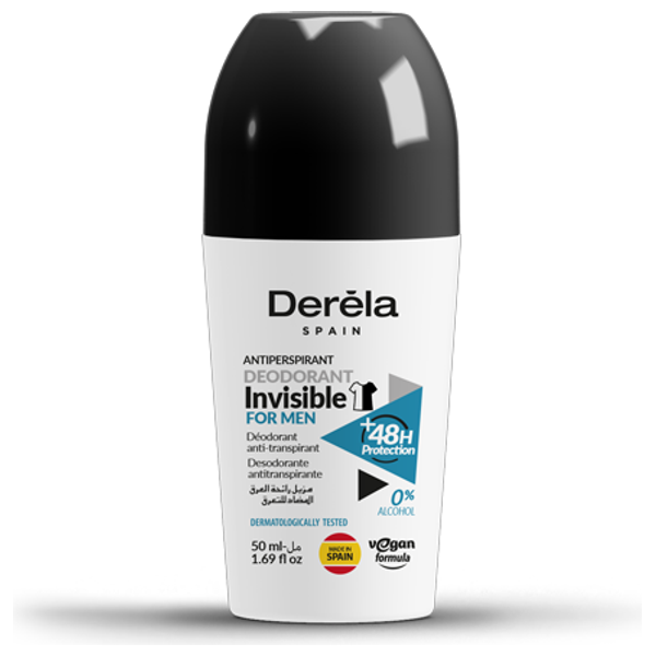 Derela Spain Invisible Roll-on Deodorant for Men offers reliable odor and moisture control while staying invisible under clothing. The alcohol-free, plant-based formula is gentle on skin and dermatologist tested, providing up to 48 hours of protection without leaving white marks on fabrics. Comes in a convenient 50 ml size.