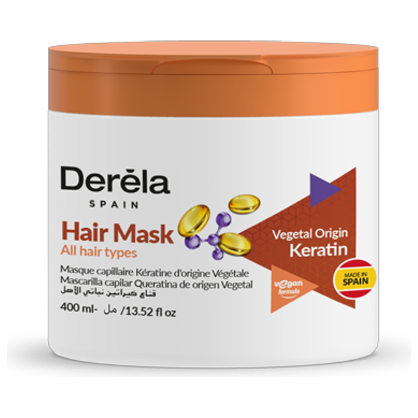 Derela Spain presents the Vegetal Origin Keratin Hair Mask, a plant-based formula that nourishes, strengthens, and smooths all hair types. The Keratin extract helps to detangle and boost shine. How to use: after washing, apply a moderate amount from scalp to ends, leave for 10–30 minutes, then rinse with warm water.