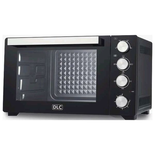 The DLC 70L Black Oven is a versatile countertop conventional oven featuring four mechanical knobs to control temperature and select top, bottom, or both heating modes. It includes a dual heating system (top and bottom), a fan for even heat distribution, a heat-resistant glass door, and a scratch-resistant stainless steel handle. A rotisserie, an air fryer basket, and a built-in timer expand cooking options across five programs for everyday meals.