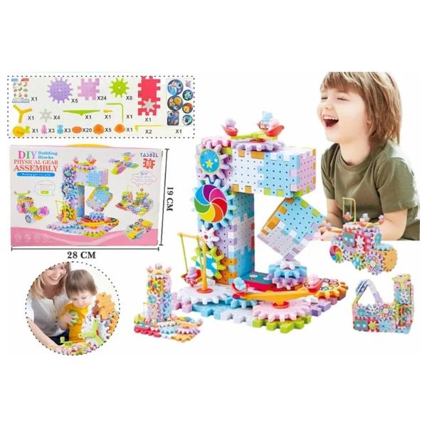 An educational electric gear cube toy for children aged 3 and up, containing 83 pieces including gears, interlocking blocks, a swing set, and a spinning wheel. It is battery-operated with a built-in motor that automatically rotates the gears. Made of safe and non-toxic ABS plastic, it promotes creativity, problem-solving skills, and geometric and motor thinking.