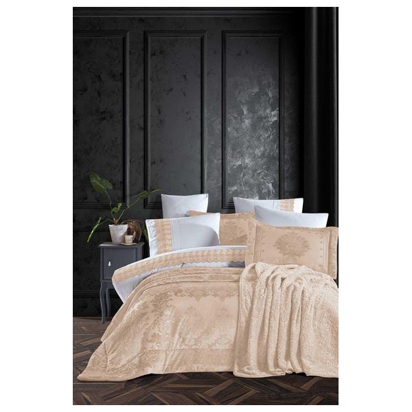 The Turkish-made set consists of 10 pieces including a 260x240cm duvet, a 220x200cm duvet cover, a 260x270cm fitted sheet, six 50x70cm pillowcases, and one blanket.