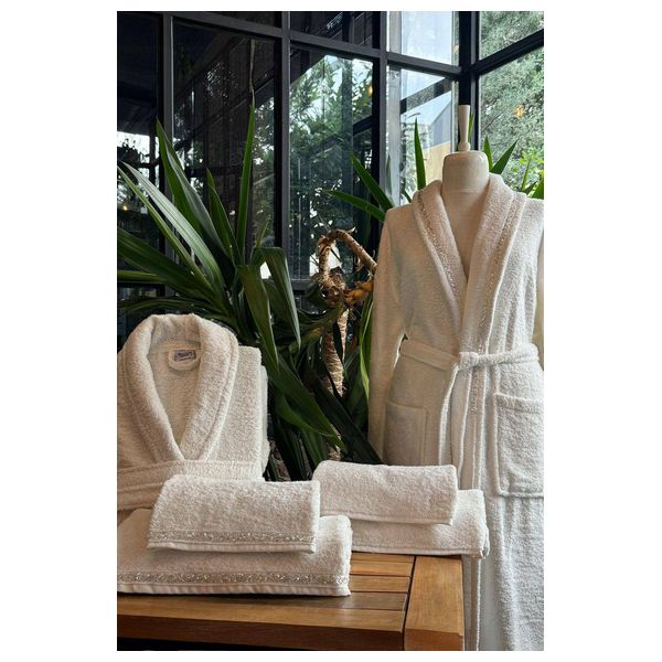 A 6-piece double towel and robe set, made from 100% cotton, includes two robes (men's size L/XL, women's size S/M), two body towels (135 x 70 cm), and two hand towels (85 x 50 cm).