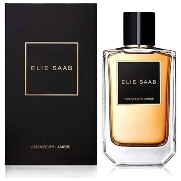 Essence No.3 Ambre by Elie Saab is a unisex fragrance in a 100 ml bottle. It opens with spicy notes and bergamot, develops into a heart of amber, patchouli and jasmine, and resolves with a base of vanilla, woods and musk. The bottle is clear with amber liquid and is packaged in a black box with a gold border for a premium presentation.