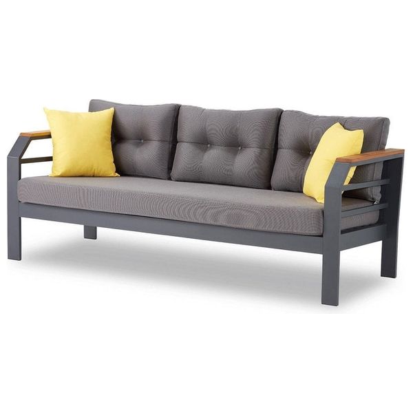 A rust-resistant aluminum frame with water-resistant cushions and iroko wood inlays adds a warm, natural touch.