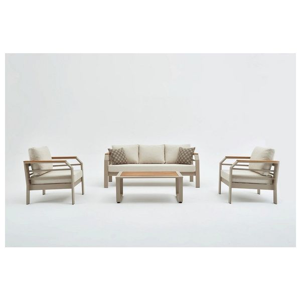 The set includes two single chairs, a three-seater sofa, and a low coffee table in the center. The frame is made of aluminum with iroko wood accents, and the sand-colored olefin fabric cushions are washable, water-resistant, and fade-resistant.