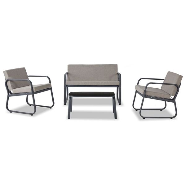 It consists of two double sofas, two single sofas, and a coffee table, all built on a sturdy metal frame and coated with an electrostatic powder finish for durability. Water-resistant fabrics with a high density ensure comfortable seating.