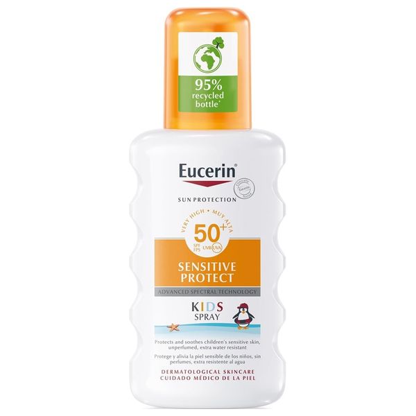 Eucerin Sun Kids Spray SPF 50 is a spray sunscreen for children designed for use on the face and body. It provides broad UVA/UVB protection with SPF 50+, is fragrance-free, gentle on sensitive skin, and offers extra water resistance for active outdoor days. The 200 ml bottle makes it easy to apply and share among family members.