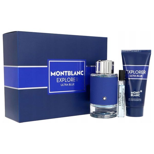 Explorer Ultra Blue perfume set for men, with the scent of bergamot, pink pepper and amber, contains an Eau de Parfum of 100 ml, a mini perfume of 75 ml, and a shower gel of 100 ml.