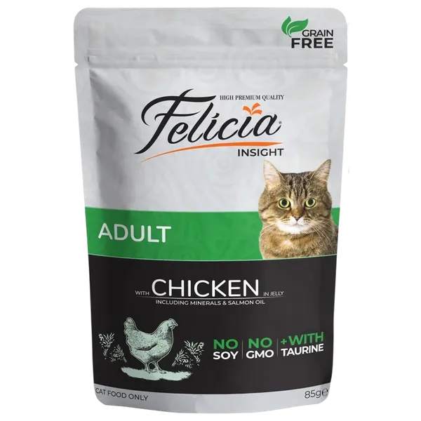 A grain-free wet cat food designed for adult cats. It features chicken as the main protein source, along with minerals and taurine to support immunity, muscle function, and daily vitality. The gel texture aids hydration and urinary tract health, while salmon oil provides benefits for skin and coat.