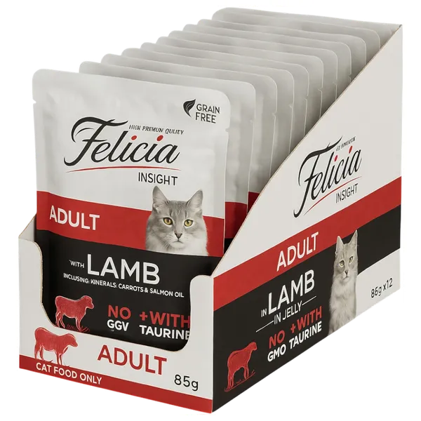 A complete wet food designed for adult cats, using lamb as a protein source to provide easily digestible protein and a palatable flavor. The recipe contains added vitamins, minerals, and taurine to support immunity and muscle health. Its high moisture content supports hydration and urinary tract health, while the gel texture provides an appealing feel.