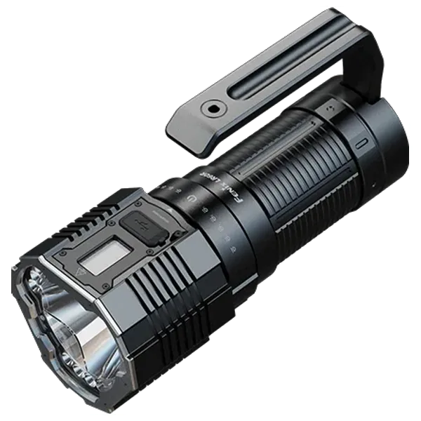 A high-performance flashlight for rugged outdoor use, delivering 21,000 lumens and a beam range of up to 1,085 meters, with a runtime of up to 113 hours. It features an OLED display to monitor brightness, runtime, and battery level, a rotary switch for quick mode changes, a removable metal handle, a shoulder strap, and a tripod base. It is powered by four removable 4,000 mAh batteries.
