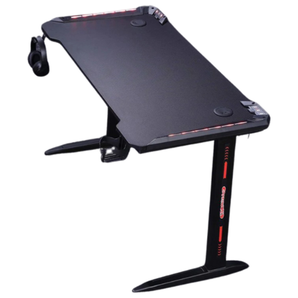 The D2111-RGB Gaming Desk features a sleek carbon fiber surface with RGB lighting and remote control, plus a built-in headphone hook and cup holder for convenience. Dimensions: 75 × 140 × 60 cm, perfect for any gaming setup.