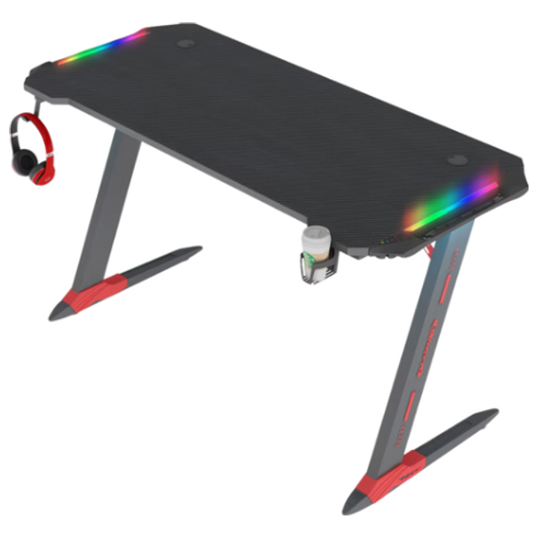 The D2201-BLACK-RGB Gaming Desk features a sleek black carbon fiber surface with RGB lighting and remote control, plus a headphone hook and cup holder for an organized and comfortable gaming experience. Dimensions: 75 × 140 × 60 cm.