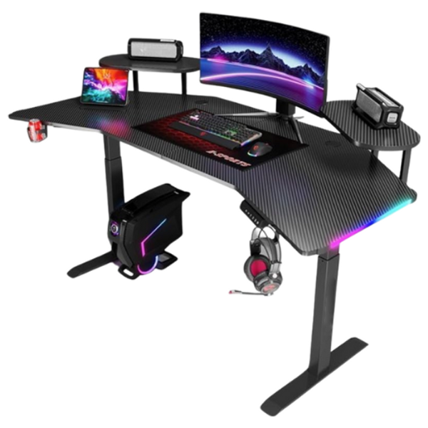 The DESK-GAMING-Y105 features a sleek carbon fiber desktop with integrated RGB lighting and remote control for customizable ambiance. Includes a headphone hook and cup holder for convenience. Adjustable height from 72 to 117 cm, with a spacious 160 × 65 cm surface for all your gaming gear.