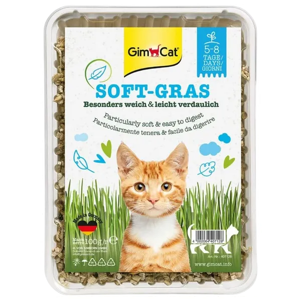 Ready-to-use cat grass aids digestion and hairball management. The grass is soft, easily digestible, encourages chewing, and provides natural nourishment for house cats. It grows in 5–8 days.