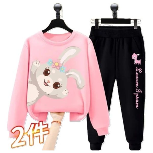 This set consists of a pink bunny-print sweater and matching black pants. The set offers comfort suitable for everyday activities and is easy to care for.