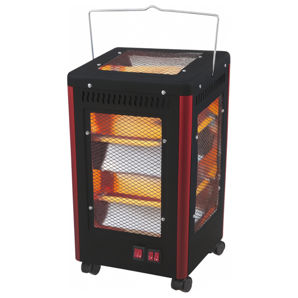 This powerful 2000-watt quartz heater provides fast and efficient heating thanks to its multiple heating elements. It features a safe design with a metal safety grill and independent switches for temperature control. It operates on 220-240V / 50-60Hz and is equipped with a wheeled base for easy transportation.