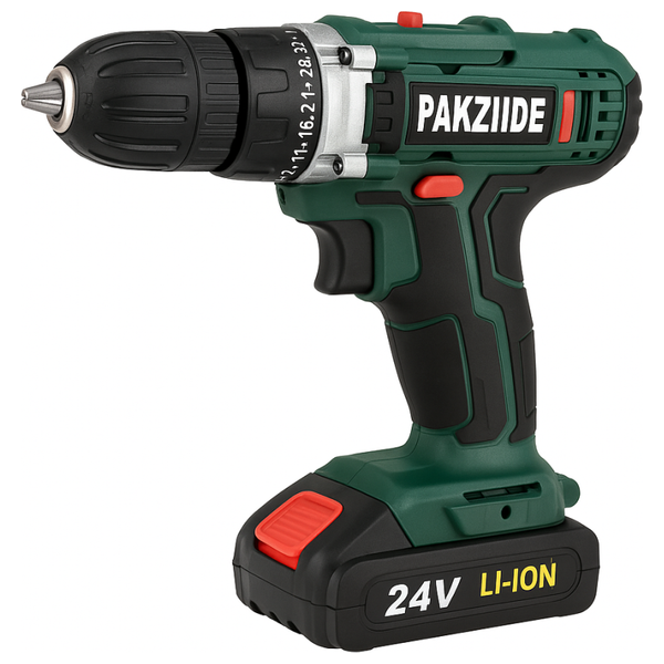 24V rechargeable lithium battery, two speed settings for performance control, torque up to 26 Nm, 10mm diameter drill chuck, ergonomic and lightweight design, suitable for drilling in wood, metal and plastic