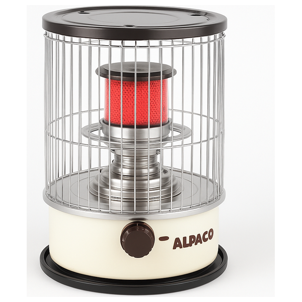 It provides powerful warmth with a 5.3-liter fuel tank and adjustable heating in a compact metal casing. It delivers 8400 to 10000 BTU/hr, consumes 0.24-0.3 liters/hr, and operates for 14-18 hours on a full tank.