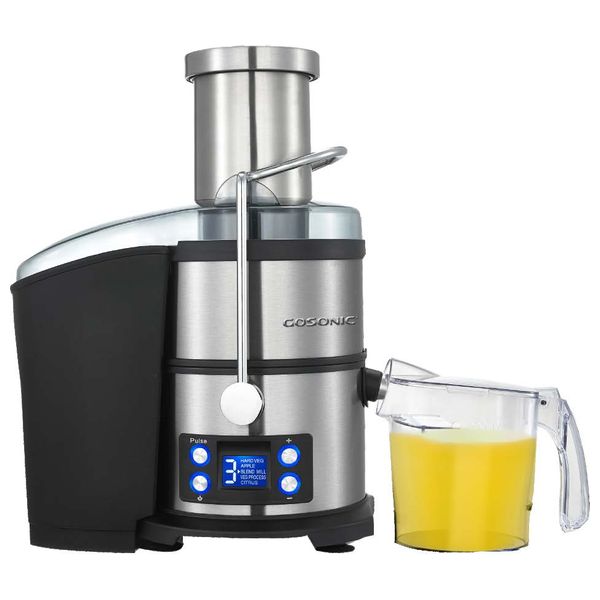Gosonic electric fruit juicer, 1000W power, 2L jug and 0.8L cup, large 85mm feed chute for efficient juicing, stainless steel body cover, anti-drip juice spout, 5 selectable speeds, stainless steel fruit inlet, 220-240V / 50-60Hz.