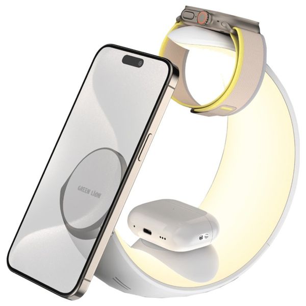 The Green Lion Moon Charge 4 in 1 Charger is a multi-functional wireless charging stand that combines high performance with modern design. Designed to provide a fast and safe charging experience for all your smart devices, with a unique aesthetic touch thanks to its RGB ambient lighting and rainbow patterns.