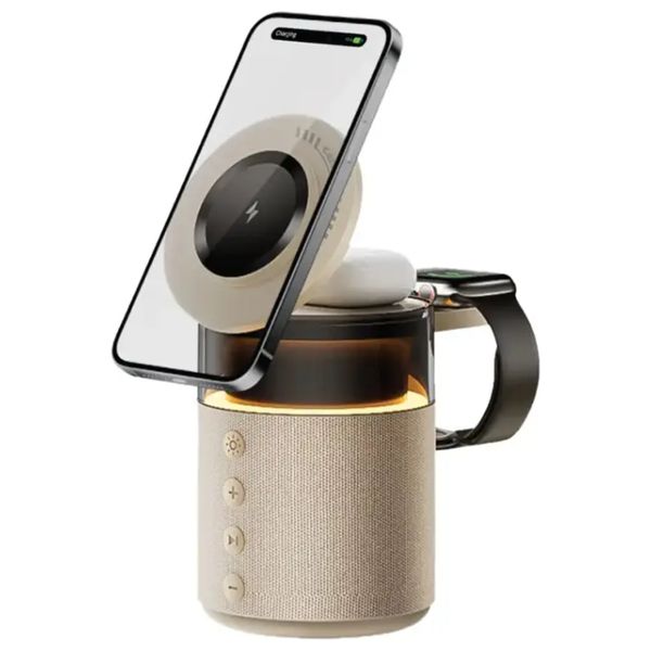 Product Description:The Green Lion 5-in-1 Wireless Charger is the ideal solution for charging all your devices easily and safely. It combines elegant design, durability and powerful performance, while supporting a wide range of smart devices such as phones, smart watches, headphones, and speakers.Key Features:Multi-Channel Charging: Different power outlets: 15W, 10W, 7.5W, and 5W for phones; 5W for earphones; 2.5W for smart watches; 5 watts for speakers.Built-in Bluetooth: Equipped with Bluetooth V6.0 for easy speaker operation and voice control.Powerful Built-in Battery: 1800mAh capacity to provide up to 5 hours continuous playback via the speaker.Fast and Efficient Charging: Support two 5V/3A or 9V/3A inputs with 27W maximum input power.Ease of use: “Snap & Charge” feature to easily place devices on the charger, with practical control buttons to control the speaker.Elegant Design: Equipped with ambient lighting that adds a touch of elegance, ideal for home or office use.