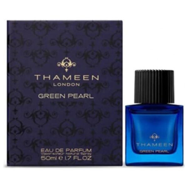 Green Pearl by Thameen is a unisex Extrait de Parfum (50 ml) that opens with bergamot, apple, neroli, and mandarin orange, moves to a heart of green notes, tea, artemisia, and pepper, and settles on a base of musk, oakmoss, and tonka bean. The cobalt blue bottle and ornate packaging reflect Thameen London's luxury aesthetic.