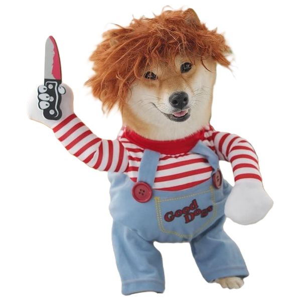 Chucky-inspired costume, made of soft cotton and polyester with padding in the arms and torso for comfort and warmth. Comes with a hat and an adjustable or removable knife-shaped accessory.