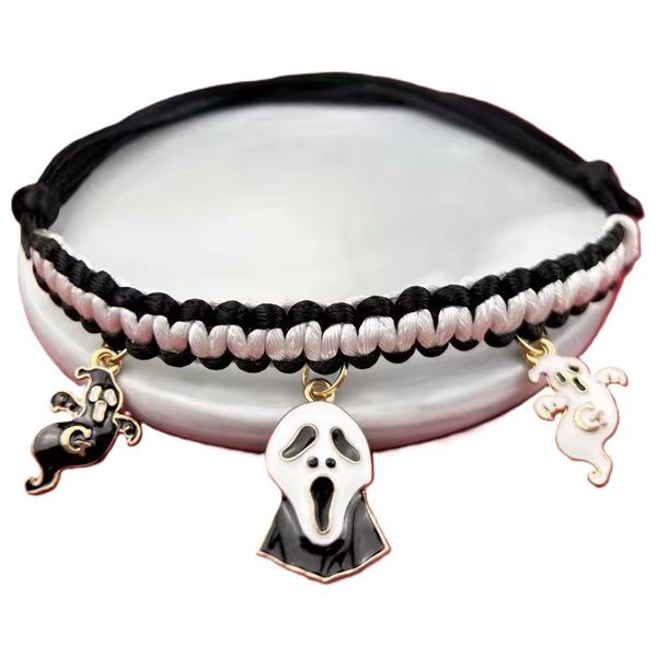 Adjustable Halloween cat collar, with braided rope and festive charms (pumpkin, ghost, skull), provides daily comfort for cats