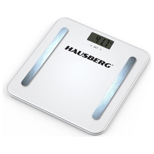 Hausberg Glass Body Fat Scale is a digital body composition scale that measures fat, body water, muscle, and bone mass for calculating BMI and kcal. The glass platform features a 62×26 mm LCD display with a 50 g graduation, powered by 2 AAA batteries. It offers auto zero and auto off, with overload and low power indicators up to a 180 kg capacity. This scale provides a reliable, easy-to-read overview of your health metrics at home.