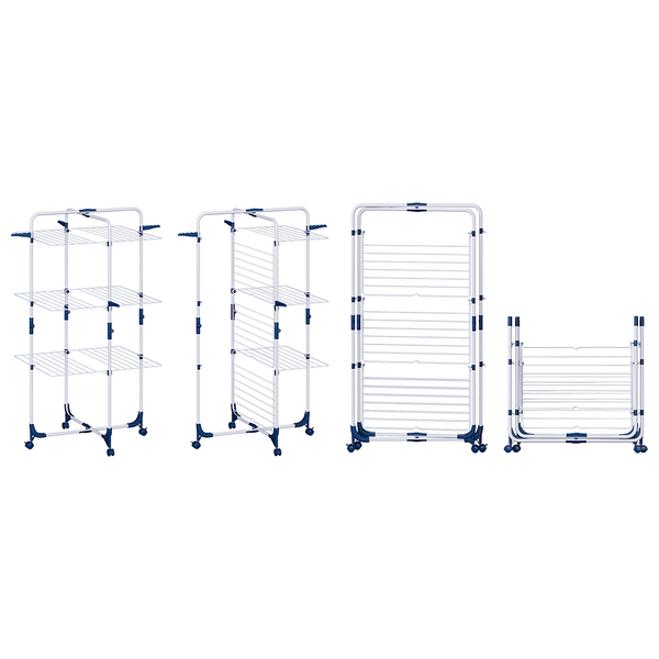 Experience efficient laundry drying with the Hausberg Tower Clothes Drying Rack. This 3-tier, foldable rack is mounted on wheels for easy repositioning and features a sliding joint mechanism for quick setup. It offers a 30 m clothesline and a 30 kg capacity, making it ideal for small spaces and growing households.