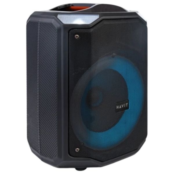 The Havit Wireless Speaker delivers a deep bass and immersive audio experience with a sleek black finish and RGB lighting. It features Bluetooth 5.0 for a stable wireless connection up to 10 meters, a 1xAux input and SD card playback, and up to 20 hours of playtime. Built-in microphones support hands-free calls and voice interactions, making it versatile for parties or everyday listening.