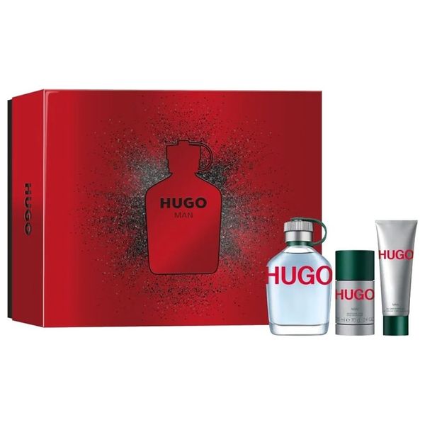 A gift set for men, consisting of: Hugo perfume EDT 150 ml, deodorant spray, 70 ml, shower gel, 50 ml.