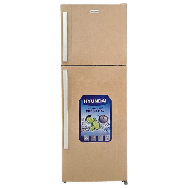 Hyundai's two-door refrigerator, with its elegant gold design, offers 24 cubic feet of space. Enhanced with a high-efficiency compressor and anti-bacterial filter, it is designed to be energy-efficient and environmentally friendly, keeping your food fresh while reducing energy consumption, making it ideal for modern kitchens.