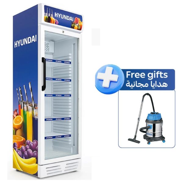 The Hyundai HBM-2800S 28ft showcase chiller in white is a compact display refrigerator designed for retail spaces. It operates with an external freezing system and delivers fast cooling, interior lighting, and modern styling. The unit draws about 1 amp and weighs around 35 kg. Capacity is 10 ft³ (30 L); cooling options include manual defrost, automatic defrost, or no frost according to model settings.