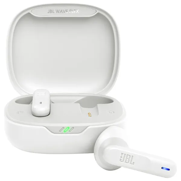 JBL Wave Flex wireless earbuds delivering deep bass sound, up to 32 hours of battery life with fast charging, comfortable ear cushions, hands-free calls with voice recognition, and water and dust resistant.