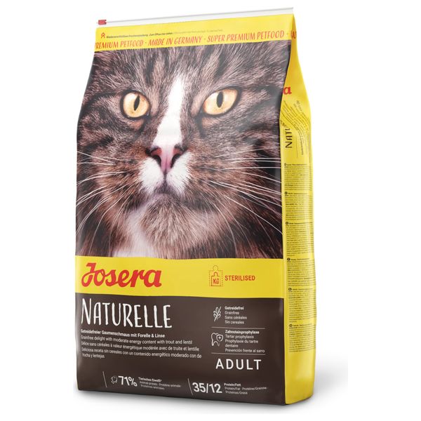 A complete diet for adult cats, featuring a grain-free recipe with trout and lentils to provide balanced proteins and adequate energy.