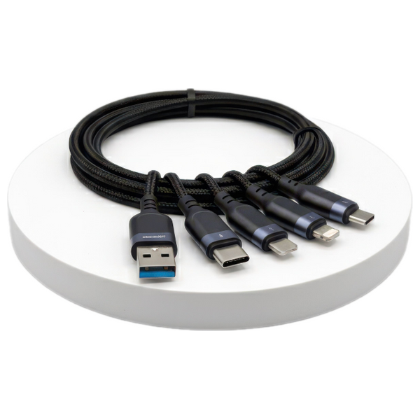 4-in-1 Multi-Functional Charging Cable allows simultaneous charging of 4 devices via Lightning, Type-C, Micro USB, and USB-A ports. Offers fast and safe charging with 3.5A output, smart chip for automatic voltage/current regulation, and thick copper core for 3x faster power transfer. Extremely durable, tangle-resistant, scratch-proof, and equipped with advanced protection against overcurrent and overheating. Perfect for travel, home, office, and multi-device charging