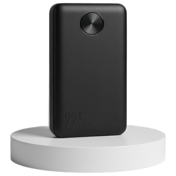 Joyroom 22.5W LED Power Bank 20000mAh offers power and versatility for daily use and travel. It features a built-in USB-C cable for wired fast charging, plus magnetic wireless charging for compatible devices. It can power up to three devices simultaneously and includes a low-current mode for small accessories; the textured black finish includes a round LED indicator for charging status.