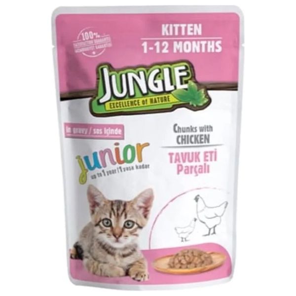 Kitten food covers the needs of kittens from 1 to 12 months old. It contains chicken pieces, providing balanced protein and essential nutrients.