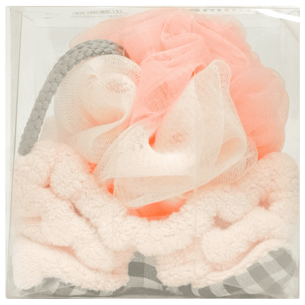 Bathing package consisting of two pieces, a soft loofah and a hair tie.