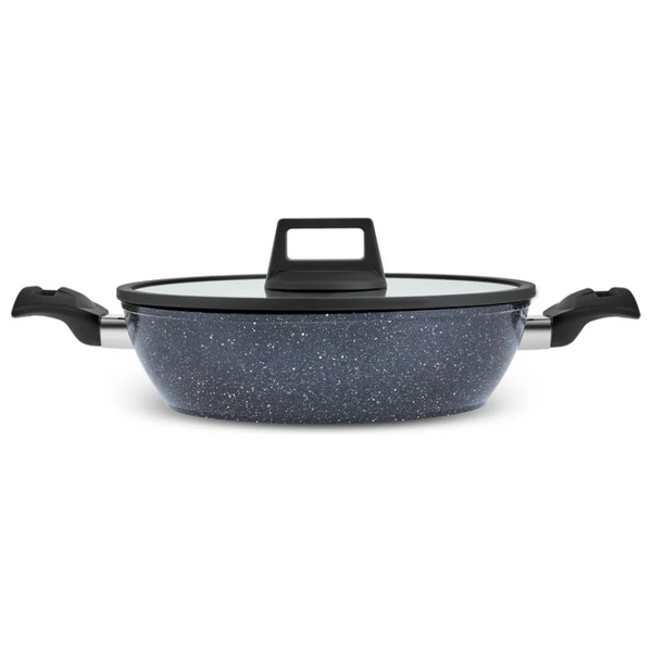 The Karaka Aqua Granite 30cm frying pan features a durable granite coating on an aluminum body for even heat distribution and healthier cooking with less oil. Its non-stick surface prevents sticking and makes cleaning easy. Suitable for all heat sources, including induction.