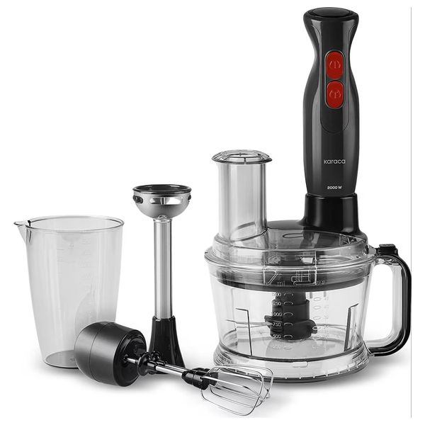 This versatile appliance combines chopping, whisking, slicing, grating, and more with speed. A powerful 2000W motor drives the various attachments for quick results. The main bowl has a 1.5L capacity, while the mixing bowl holds 800ml for smooth blends and purees. The set includes double-sided stainless steel chopping blades, two slicing and grating discs, and a heat-resistant stainless steel blender foot for hot mixtures. The ice-crushing blades enable a turbo function for enhanced performance.