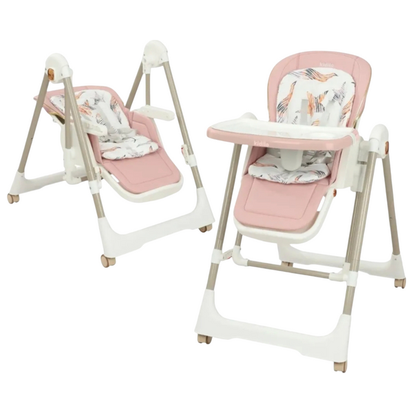 A versatile 3-in-1 baby chair that can be used as a high chair, regular chair, and rocking chair. Its ergonomic, adjustable design can support a weight capacity of up to 20 kg. Designed for comfort and practicality, it features a high-quality padded support tray for a comfortable seating experience. This chair has wheels for easy mobility, and a 5-point safety harness makes it durable and safe while your child plays or eats. The high chair is made using a combination of polypropylene plastic and metal. The foldable high chair comes with a padded seat, a detachable feeding tray, and a footrest. The adjustable, space-saving design features 5 up/down height adjustments to meet your child's changing needs as they grow and become more independent. The foldable design and height adjustment make it easy to store when not in use. Easy to clean and maintain: The durable foam seat cushions, fabric backrest, and tray inserts are easy to clean. The booster seat is stain-resistant and can be cleaned with a damp cloth. For ages 6 months to 3 years, it comes with dishwasher-safe trays. Dishwasher with plugs