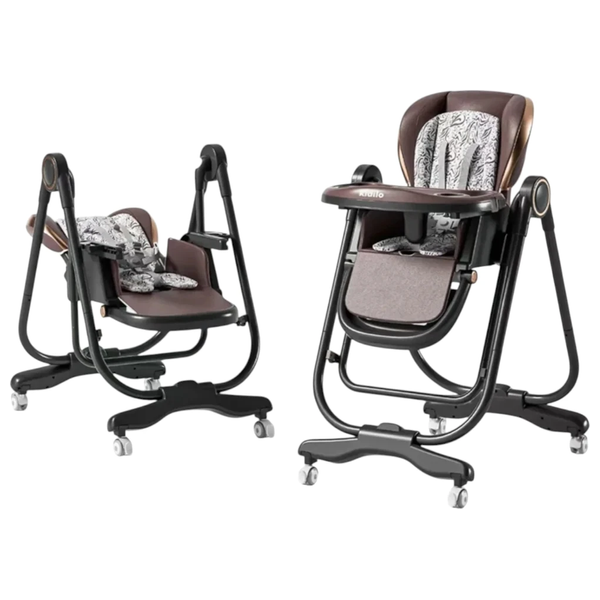 The Kidilo KD169 is a multifunctional high chair that combines a dining chair and a rocker in one, suitable from birth to about 3 years. It supports meals, play, and rest with its adjustable backrest and overall flexible design. The chair features an adjustable height to match table level, a 5-point harness for security, a removable tray for easy cleaning, wheels with a locking mechanism, and a foldable frame for compact storage. Made with soft, wipe-clean materials to maintain hygiene, it adapts to growing children while fitting.