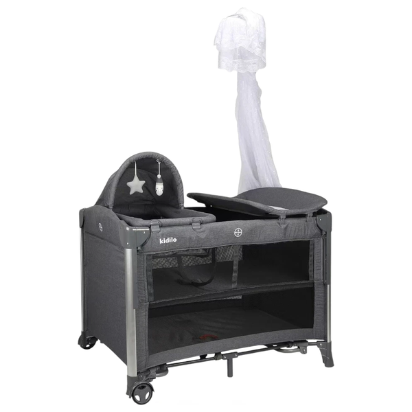 The Kidilo multifunctional crib combines a sleeper, rocking bassinet, play area, and changing table, suitable from birth to approximately 4 years. It features lightweight, foldable design for easy transport and travel, two height levels to accommodate your growing child, mesh sides for ventilation and visibility, a safety harness for securing it to the parent's bed, a mosquito net, hanging musical toys, and a foldable changing unit.