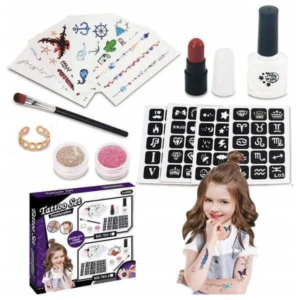 This kit offers a creative way for children to explore the art of tattoos with glitter designs. It includes 36 glitter tattoo designs, 5 adhesive tattoo sheets, 2 glitter packs, glitter glue, a brush, lipstick, and a ring. The kit supports two application methods: glitter tattoos using glue and glitter, and water-based adhesive tattoos. Simple step-by-step instructions guide users from stenciling to the drying of the final design for a safe and fun decorating experience.