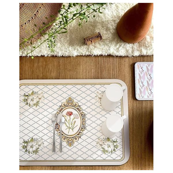An absorbent kitchen mat designed to handle spills around the sink or coffee corner. It measures 60 x 40 cm and features a leather backing to help prevent leaks and slipping.